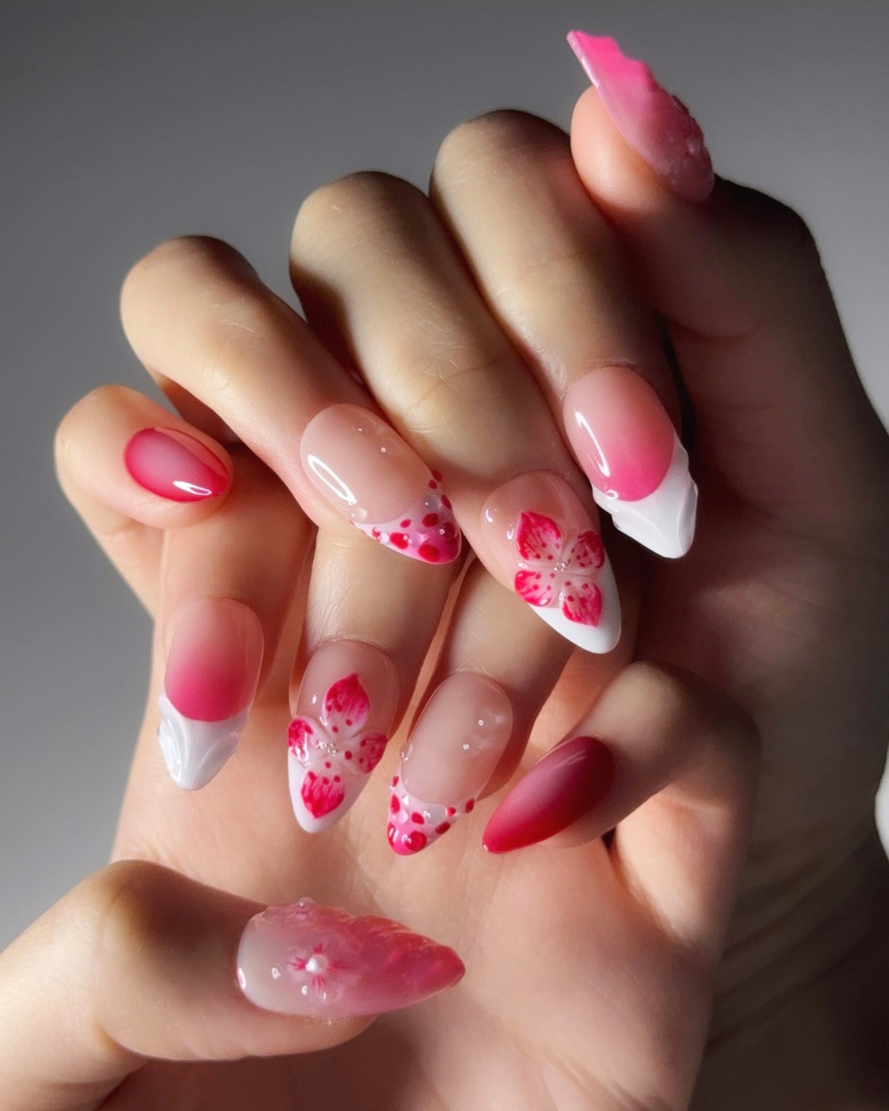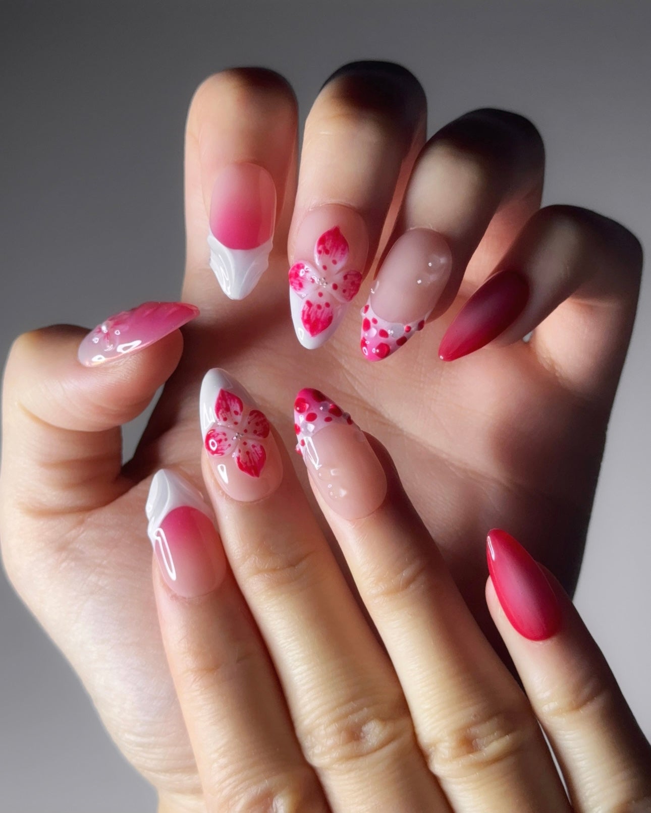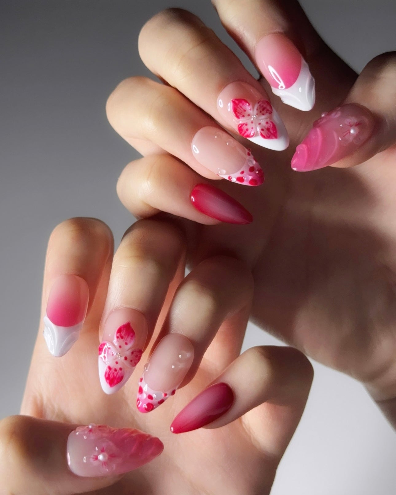 A dreamy blend of pink, beige and magenta tones, these press-on nails feature delicate pink floral details for a soft yet elegant look. Perfect for adding a romantic, feminine touch to any outfit!