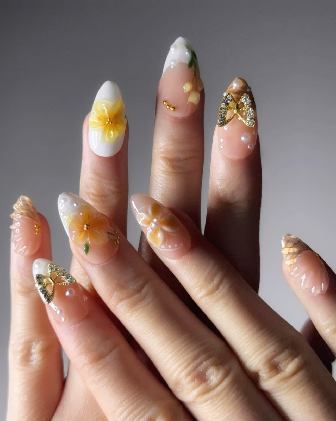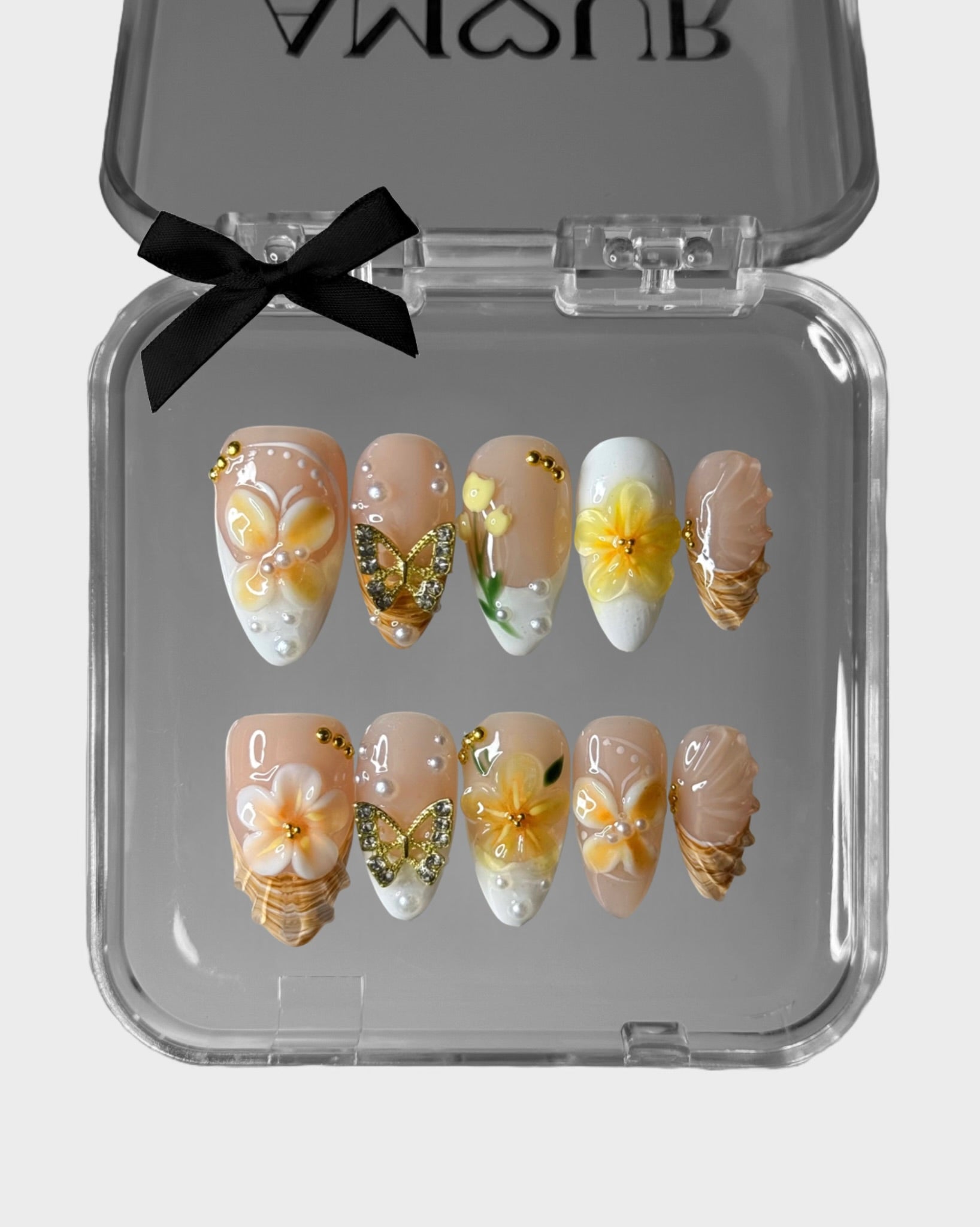 Bright, cheerful, and full of beautiful vibes, this lemon-colored press-on nail set features playful yellow butterflies, delicate flowers and charming seashell details. Perfect for adding a sunny, expressive touch to your look and spreading happiness with every gesture.