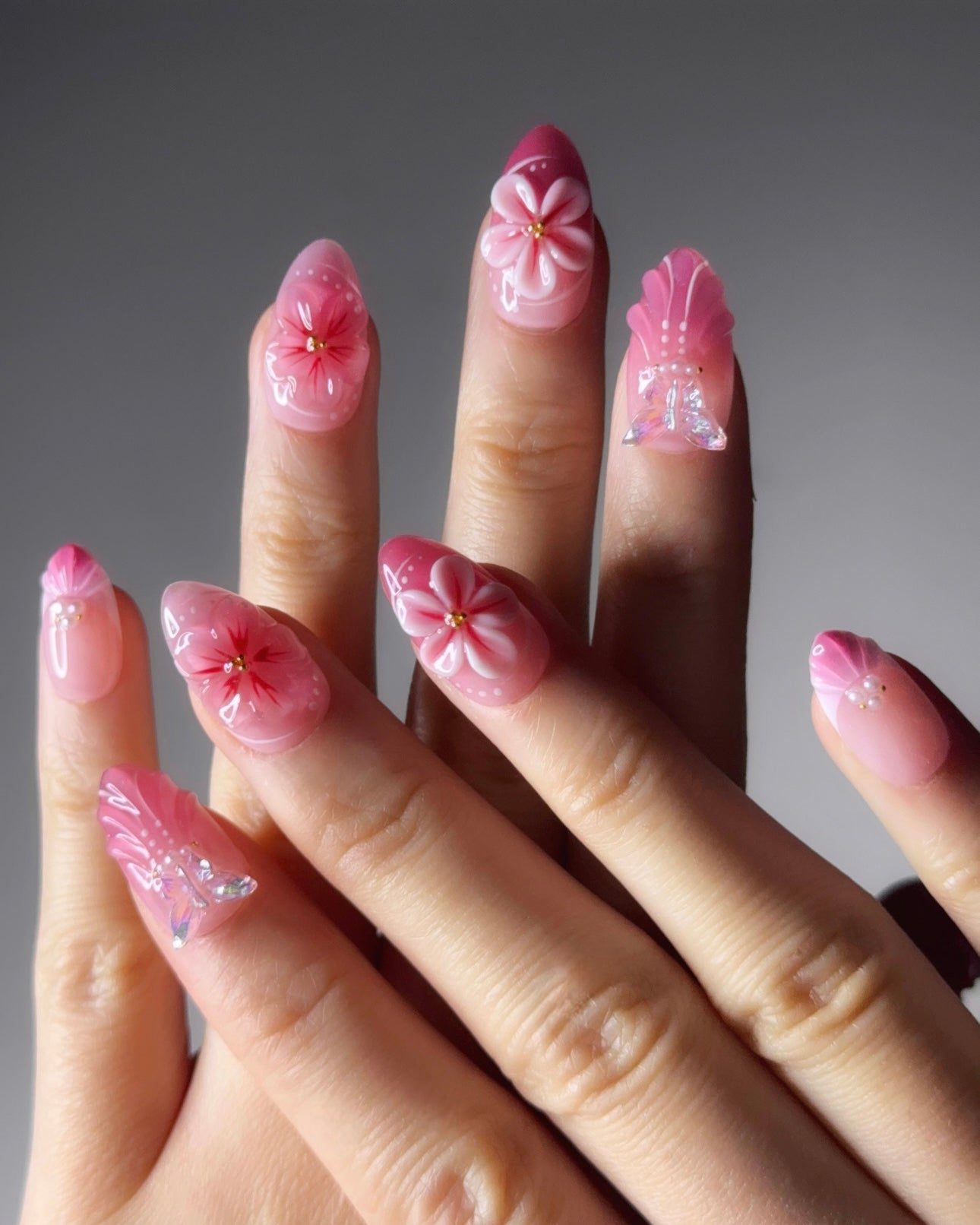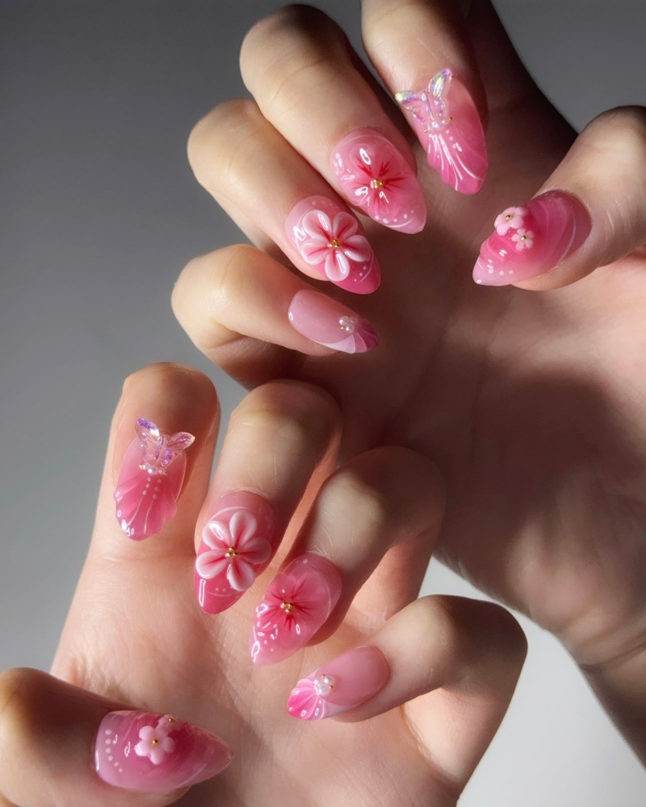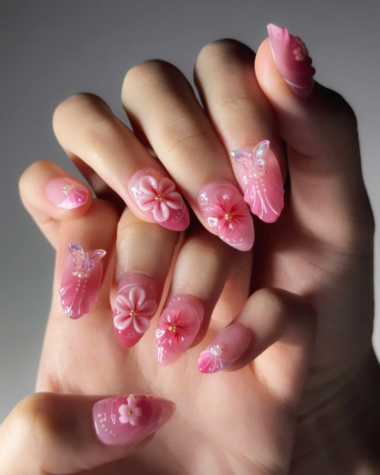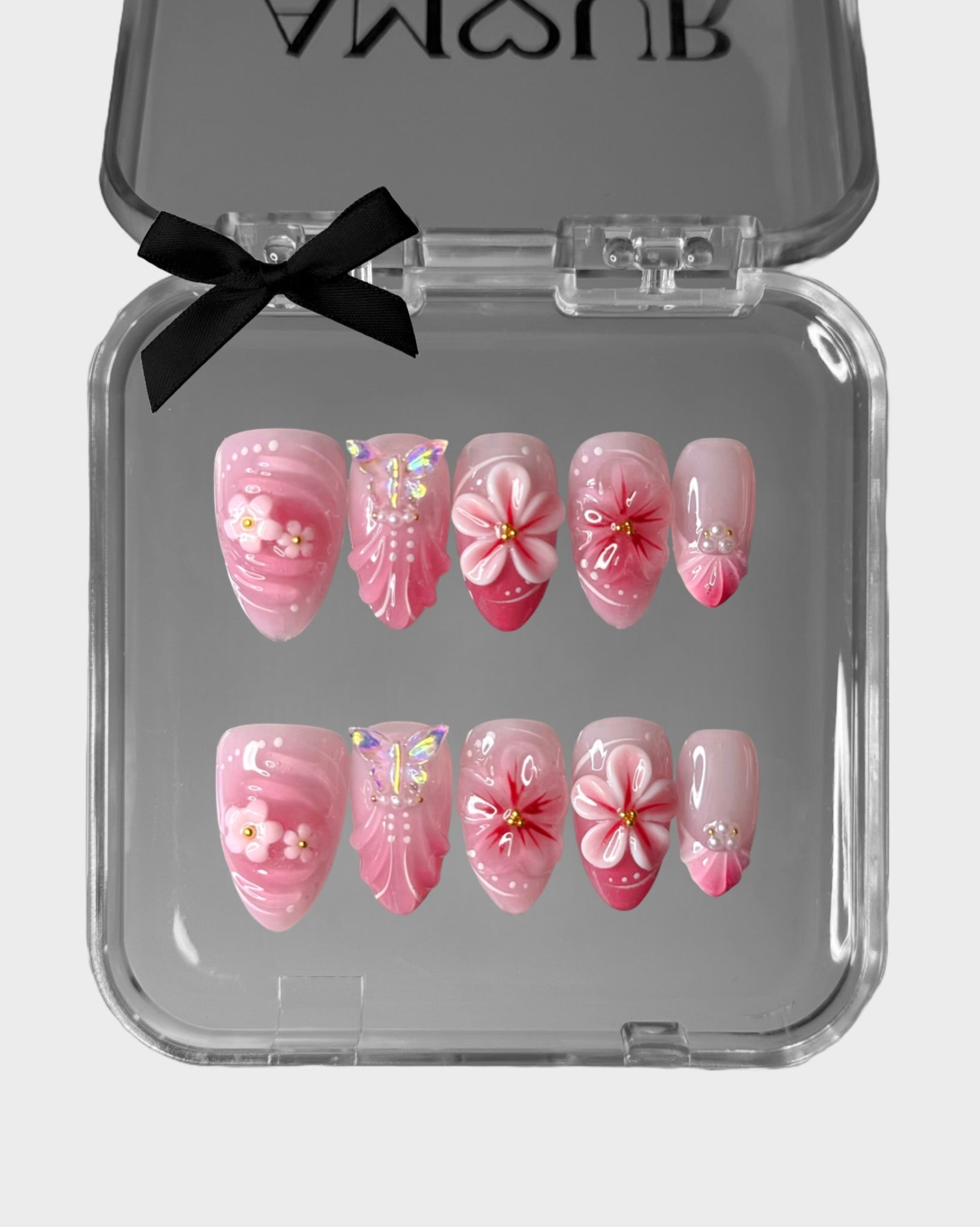 Soft, feminine, and effortlessly romantic, this short press-on nail set features dreamy shades of pink that blend into a delicate blushing effect. Adorned with pink flowers, transparent butterflies and subtle gold details, it captures the essence of femininity and sweetness in every detail.