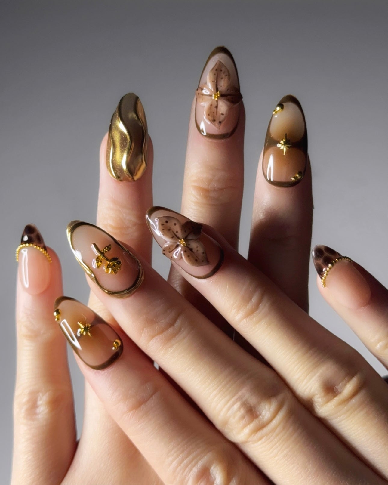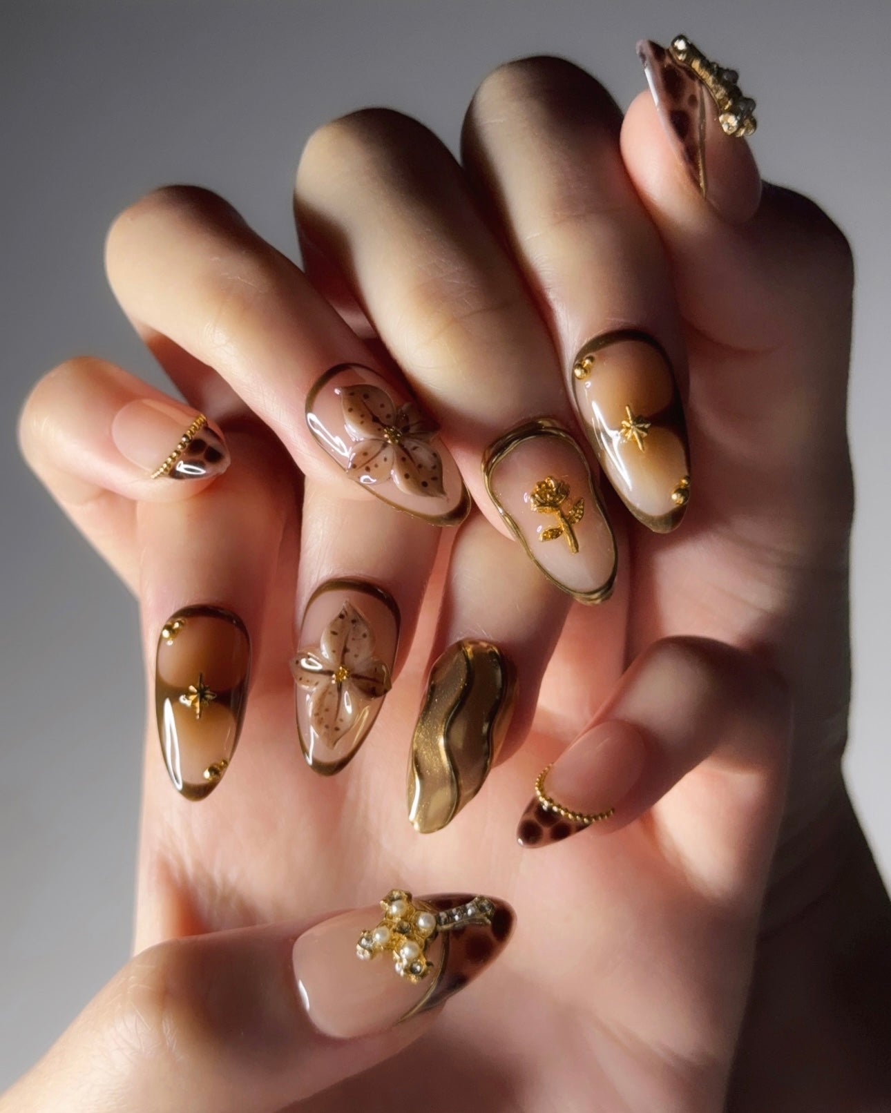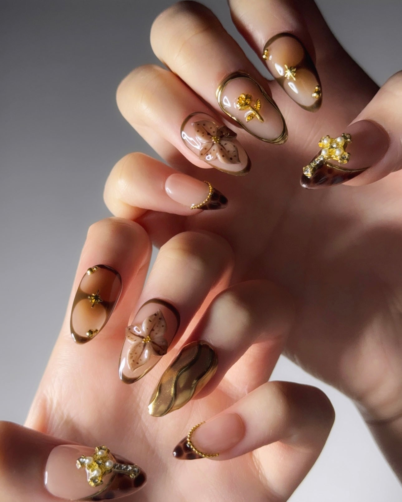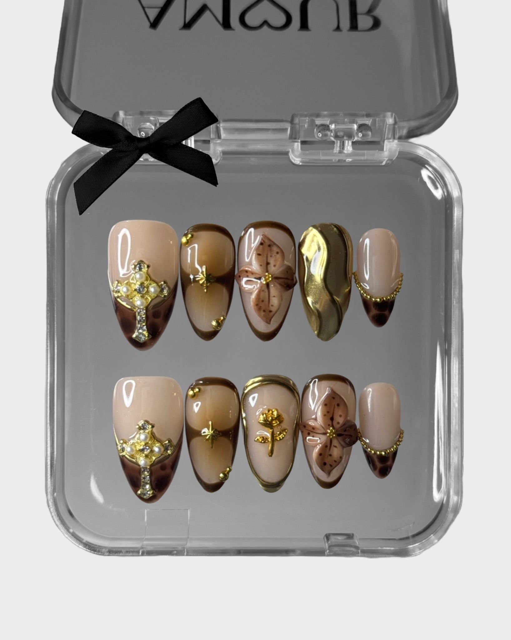 These luxurious press-on nails combine golden waves, a delicate gold cross, dark brown floral accents and shimmering gold pearls and star details. Designed for those who love a rich, elegant manicure that radiates sophistication and timeless beauty.