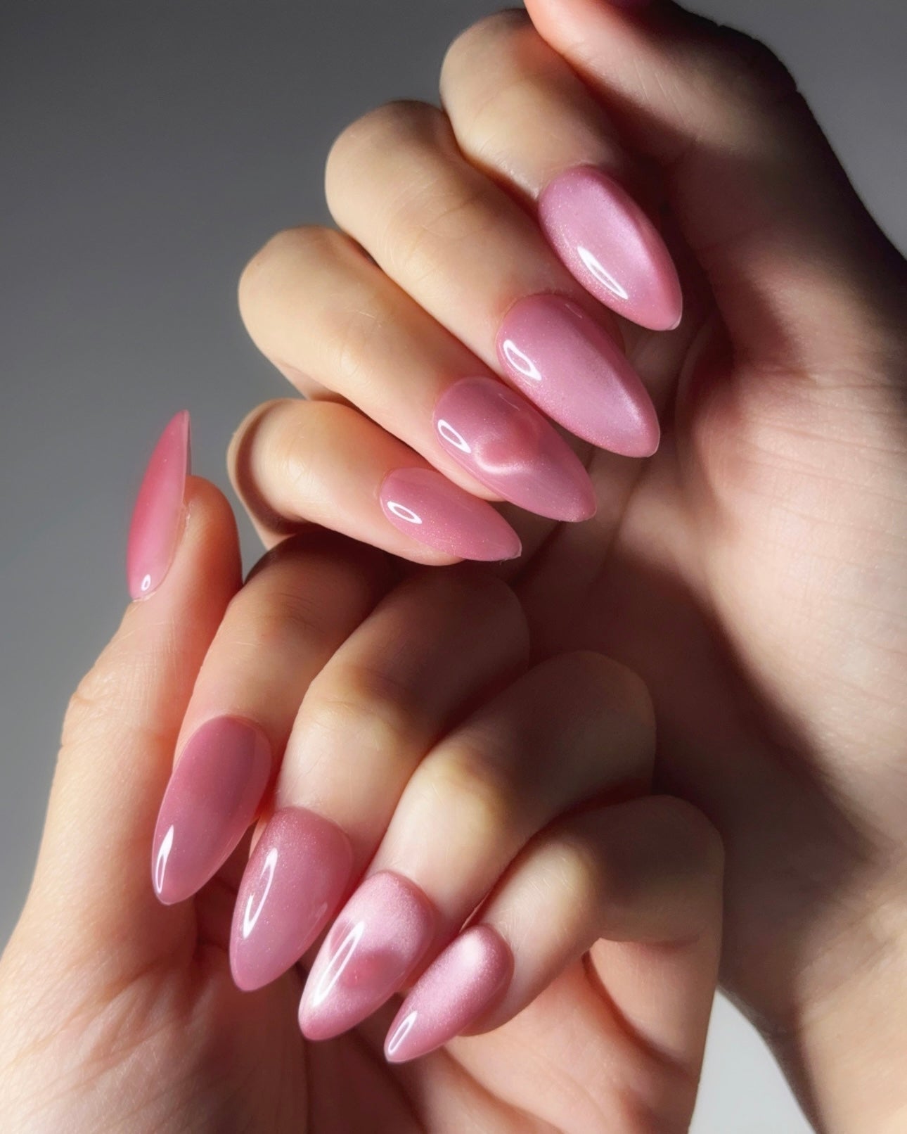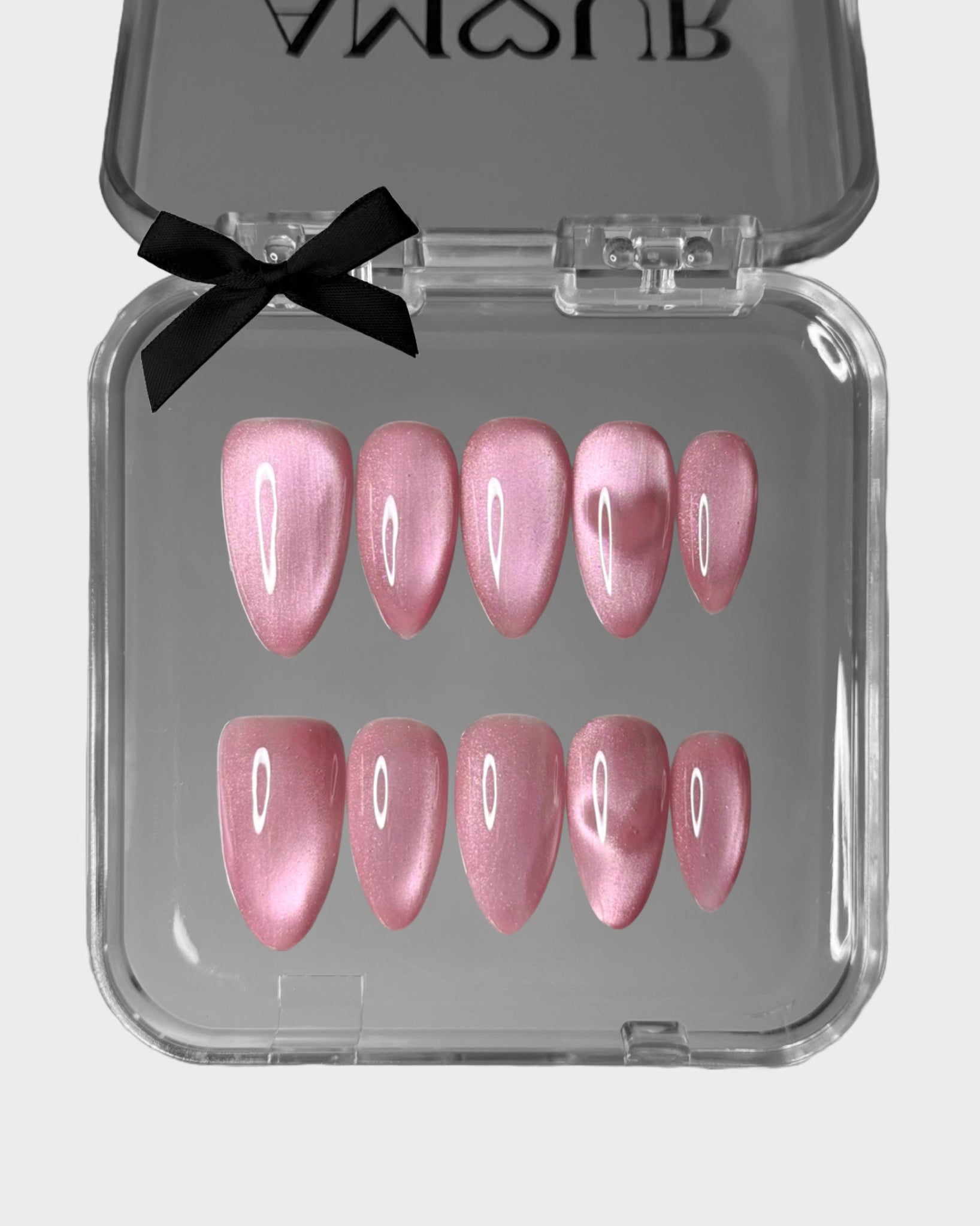 Seductive and captivating, this press-on nail set features soft pink tones with mesmerizing cat eye effects and delicate heart-shaped cat eye accents. Perfect for a feminine manicure that exudes charm and irresistible allure.
