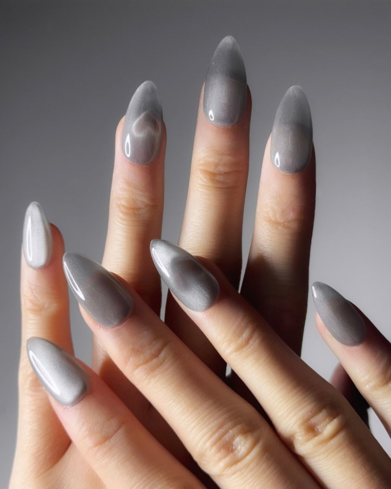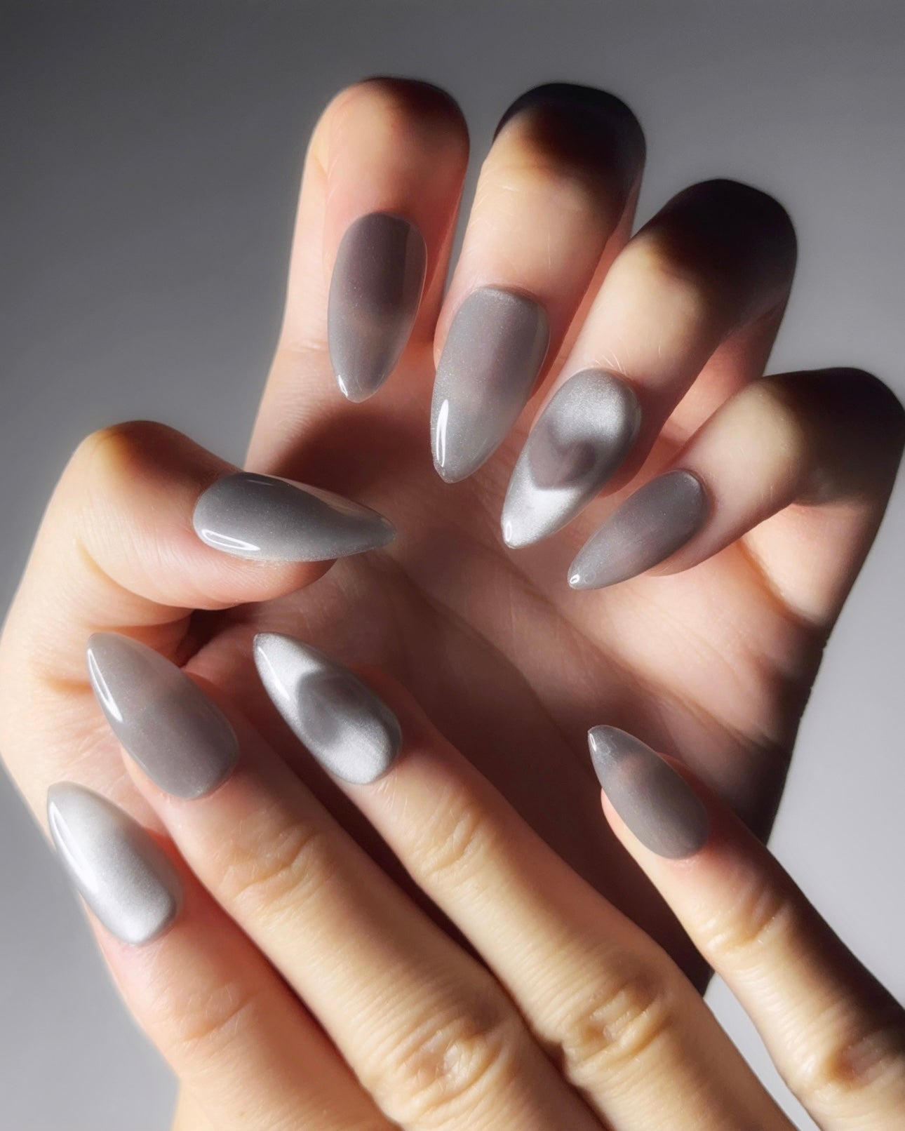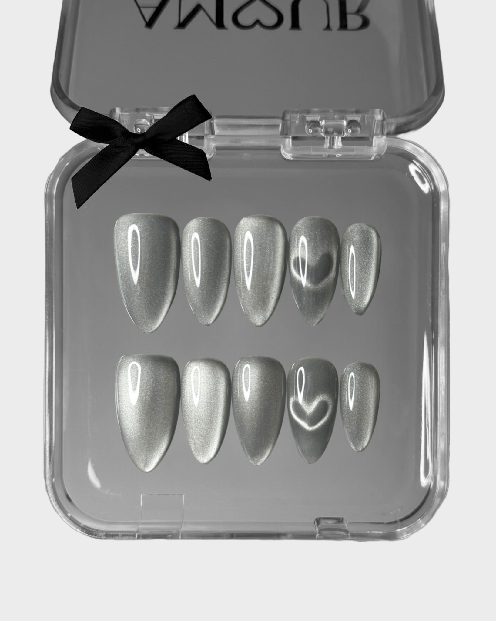 Trendy and captivating, this press-on nail set features dark grey steel tones with mesmerizing cat eye effects and subtle heart-shaped cat eye accents. Perfect for a bold, sophisticated manicure that combines mystery with a touch of elegance.