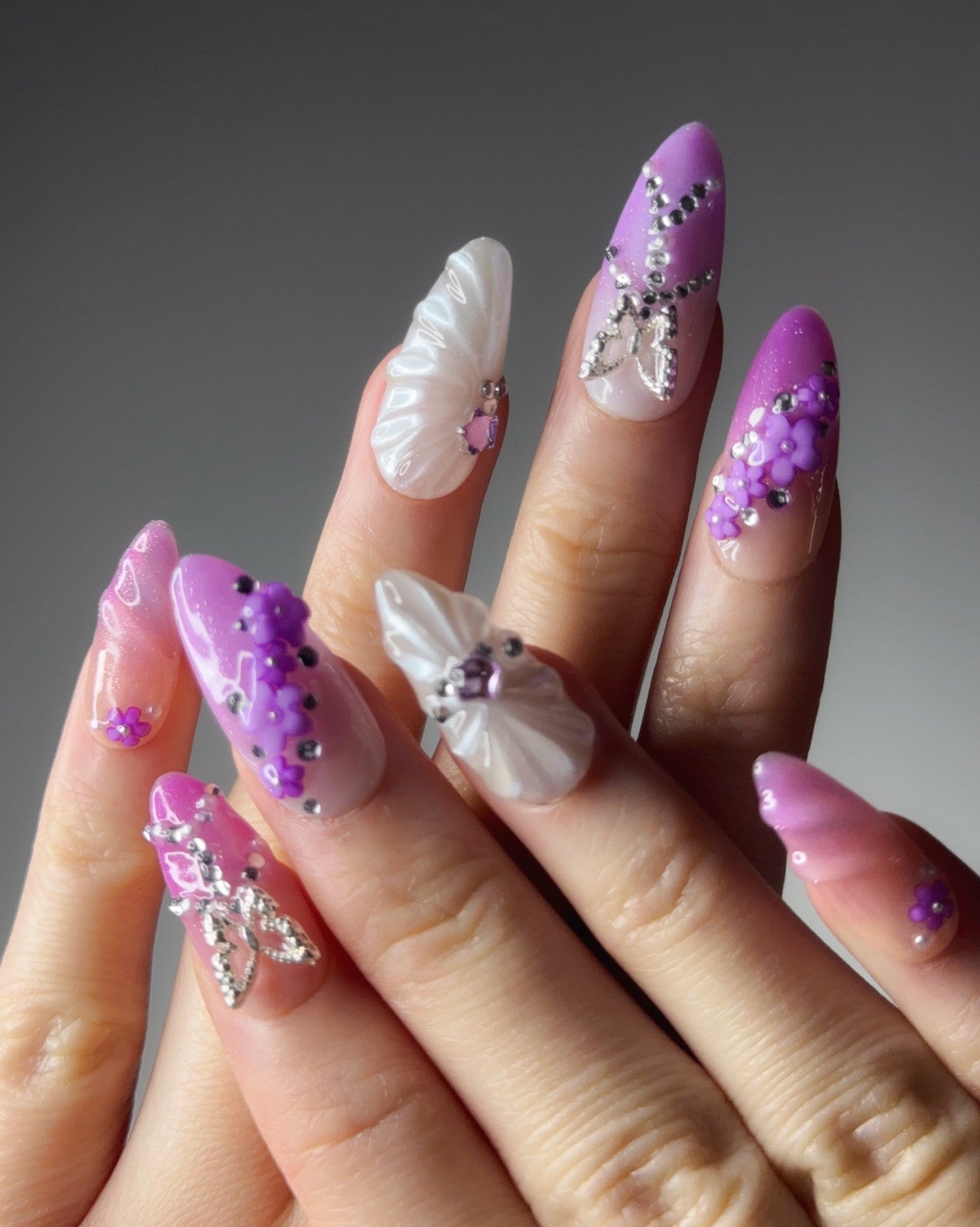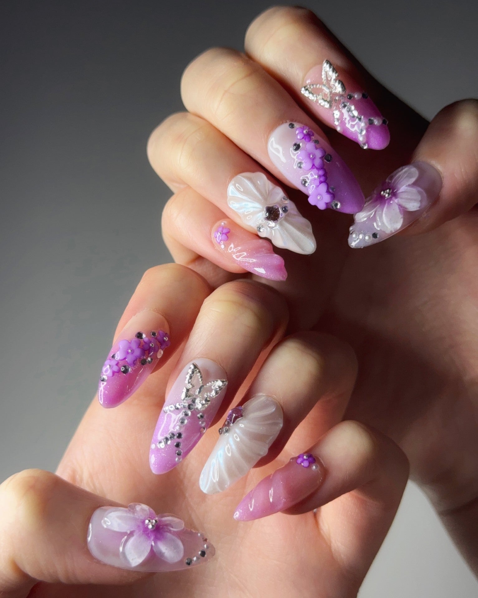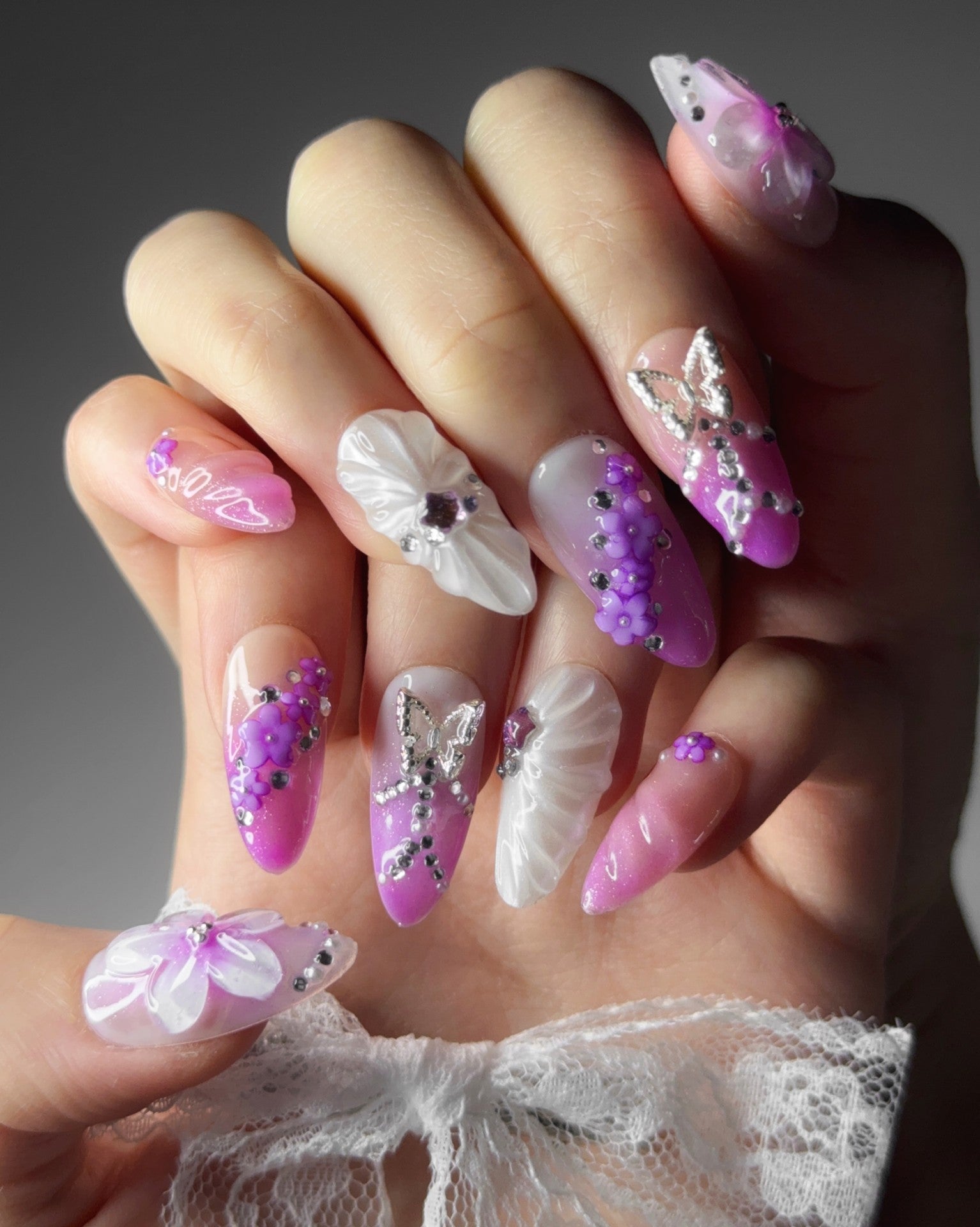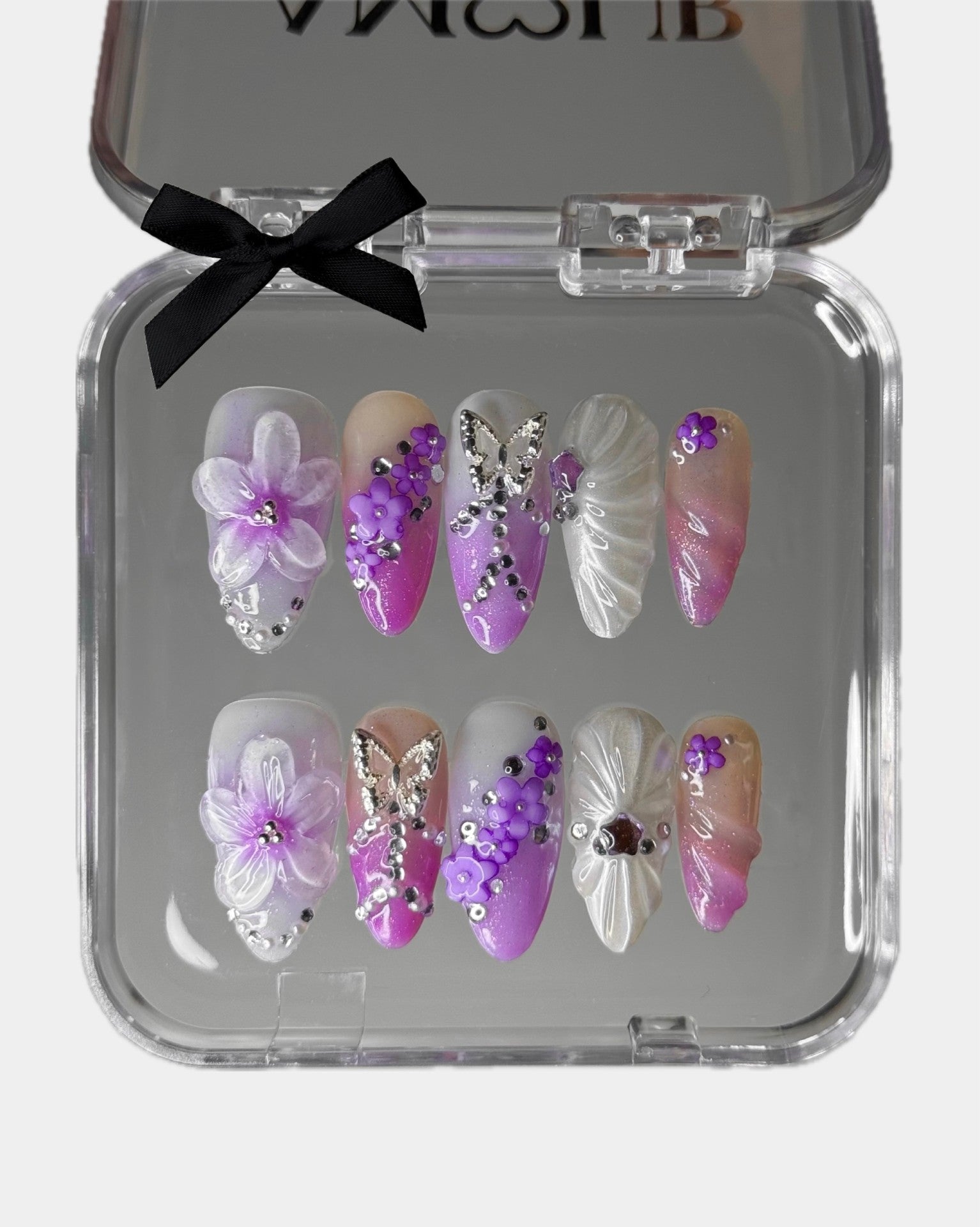 AMOUR'S "WISTERIA" NAILS: Refine your manicure with these elegant purple and floral press-on nails, designed for a soft yet sophisticated look. Featuring a delicate lilac base with intricate floral details, these nails offer a perfect balance of femininity and style.